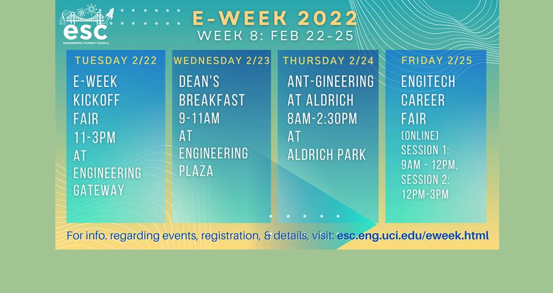 The Engineering Student Council (ESC) at the University of California, Irvine is proud to host our Annual National Engineers Week 2022. Engineers Week will be held from February 22 to 25, 2022. Events are held throughout the week to encourage student, faculty, alumni, and industry participation.