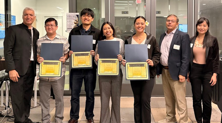 Left to right: Affiliates President Marwan Youssef; Duy Nguyen – Gary Guymon Scholarship; Brandon Luc – Pat & Bonnie Fuscoe Scholarship; Cassandra Nguyen - Robin Shepherd Scholarship; Erin Gebauer - Jan Scherfig Scholarship; Pat Fuscoe; CEE Department Chair Mo Li