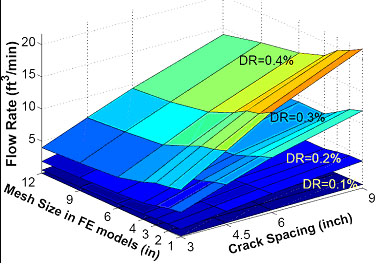 Example design curve (generated from finite element simulations) correlating design drift ratio (DR), flow rate through wall, and (assumed) crack spacing (Wang and Hutchinson).