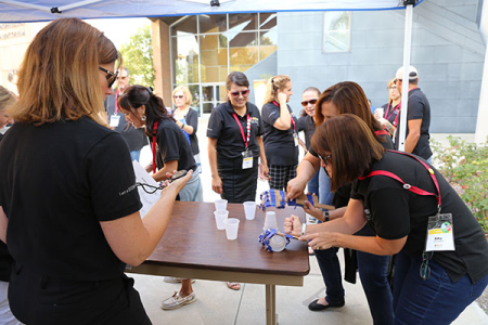 The focus was creating and nurturing STEM-rich partnerships. More than 120 participants started the day by competing in a hands-on mini-challenge, performing a series of tasks using a cardboard robotic hand. Adrenaline revved, teams tried to place cotton balls in plastic cups, flip cups upside down and stack them in the fastest time.